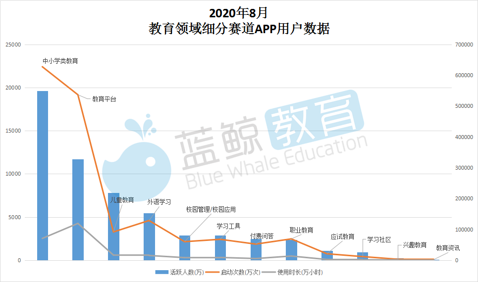 藍鯨教育智庫團隊專注於研究教育領域各賽道APP榜單,我們單獨研究過中小學教育、兒童教育、職業教育、外語學習賽道等等。之前我們打通不同賽道,將所有教育領域APP融會貫通,出品過2020年一二季度在線教育APP排行榜的相關研究成果。詳細鏈接為《Q1教育APP總排行榜:新增過億,騰訊課堂、猿題庫擠進TOP 10》《Q2教育APP總排行榜:“樂教樂學”“小伴龍”“曉黑板”跌出千萬級》,在教育行業引起眾多關注。本次我們繼續就全教育APP 7月和8月兩個月份的數據做詳細分析。