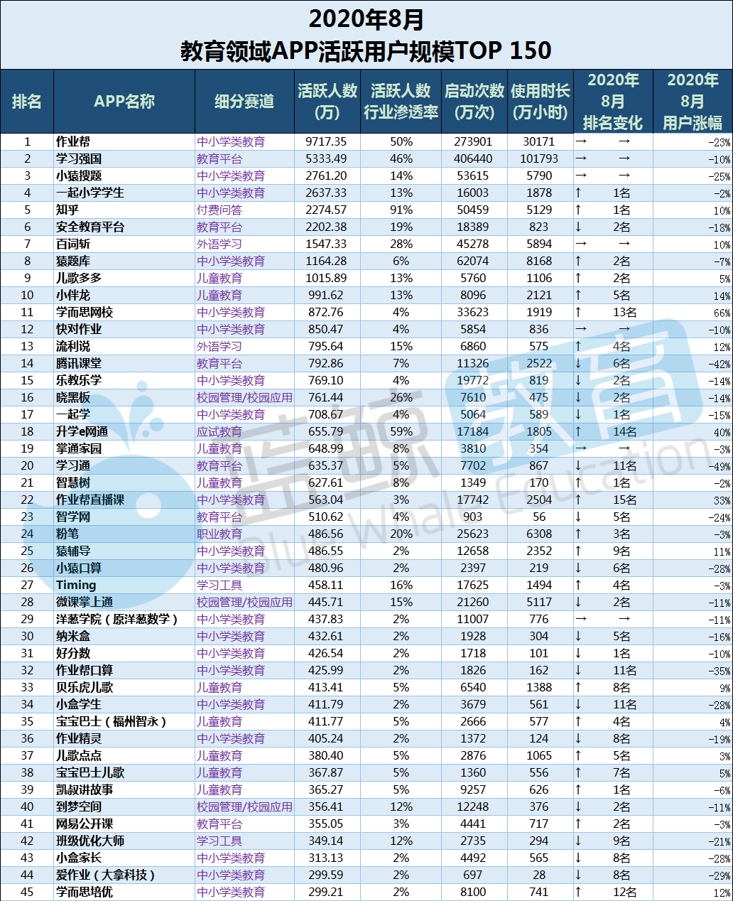 本次我們共考察了1126個教育領域APP,有千萬級、百萬級應用,下面是2020年7月末,教育領域活躍用户規模前150名APP,以及它們在2020年8月的排名變化與用户漲幅: