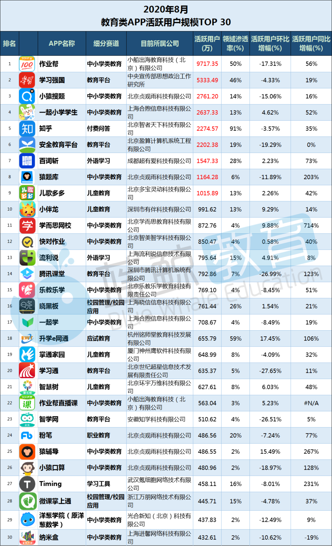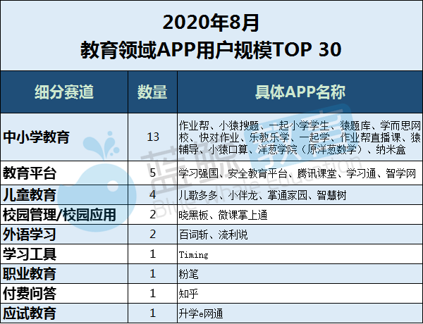 2020年8月教育領域用户規模TOP 30 的APP分別有:“作業幫”“學習強國”“小猿搜題”“一起小學學生”“知乎”“安全教育平台”“百詞斬”“猿題庫”“兒歌多多”“小伴龍”“學而思網校”“快對作業”“流利説”“騰訊課堂”“樂教樂學”“曉黑板”“一起學”“升學e網通”“掌通家園”“學習通”“智慧樹”“作業幫直播課”“智學網”“粉筆”“猿輔導”“小猿口算”“Timing”“微課掌上通”“洋葱學院(原洋葱數學)”“納米盒”。(“作業幫直播課”同比增幅因無2019年同期數據而空缺,特標為#N/A)