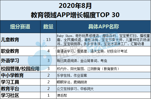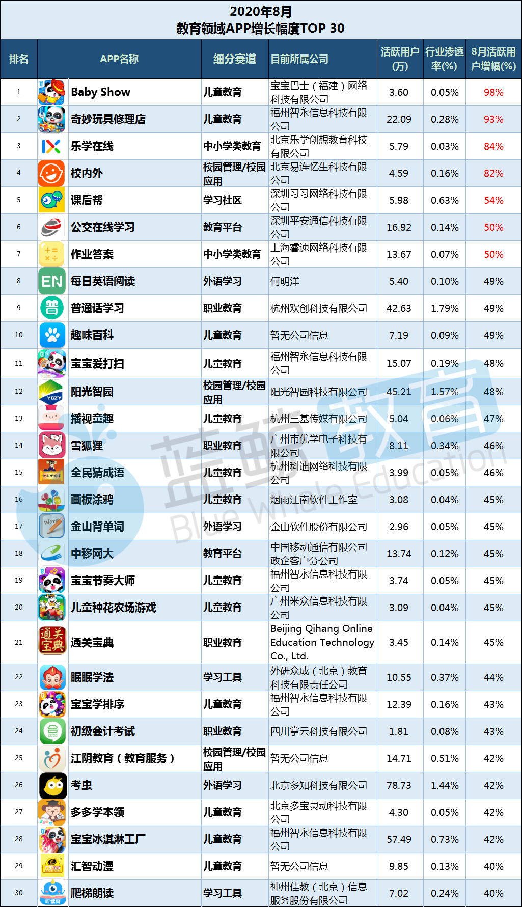 下面是2020年8月教育領域APP增長幅度排行榜TOP 30,分別有:“Baby Show”“奇妙玩具修理店”“樂學在線”“校內外”“課後幫”“公交在線學習”“作業答案”“每日英語閲讀”“普通話學習”“趣味百科”“寶寶愛打掃”“陽光智園”“播視童趣”“雪狐狸”“全民猜成語”“畫板塗鴉”“金山背單詞”“中移網大”“寶寶節奏大師”“兒童種花農場遊戲”“通關寶典”“眠眠學法”“寶寶學排序”“初級會計考試”“江陰教育(教育服務)”“考蟲”“多多學本領”“寶寶冰淇淋工廠”“匯智動漫”“爬梯朗讀”。