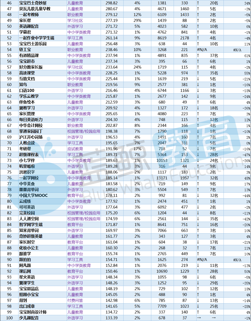 下降較為明顯的APP(按榜單從上到下)有:“冀教學習”下降18名,“超級課程表”下降28名,“小七學伴”下降24名,“中國大學MOOC”下降32名,“人人通空間”下降35名,“智學網學生端”下降16名,“家長時空”下降17名,“翼課學生”下降29名,“得到”下降13名,“出口成章”下降25名,“七天學堂”下降21名,“大力AI輔導”下降35名,“閩教學習”下降21名,“藍墨雲班課”下降13名,“今日校園”下降14名。