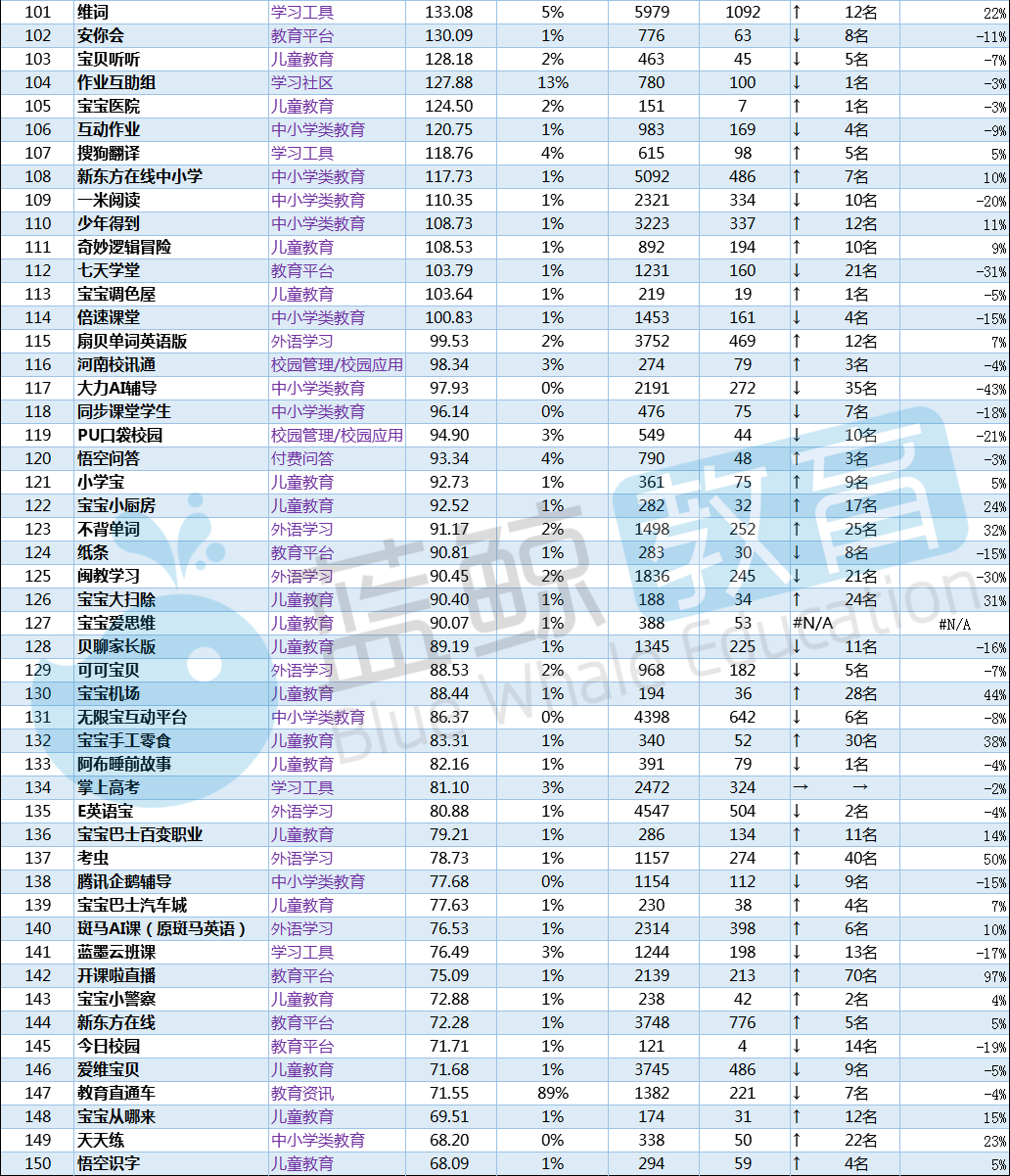 從用户規模TOP 150榜單,位次上升明顯的APP(按榜單從上到下)有:“學而思網校”上升13名,“升學e網通”上升14名,“作業幫直播課”上升15名,“學而思培優”上升12名,“寶寶巴士奇妙屋”20名,“有道精品課”上升37名,“高途課堂”上升35名,“每日英語聽力”上升12名,“一起學網校”上升32名,“課後網”上升28名,“寶寶甜品店”上升12名,“維詞”上升12名,“少年得到”上升12名,“扇貝單詞英語版”上升12名,“寶寶小廚房”上升17名,“不背單詞”上升25名,“寶寶大掃除”上升24名,“寶寶機場”上升28名,“寶寶手工零食”上升30名,“考蟲”上升40名,“開課啦直播”上升70名,“天天練”上升22名。