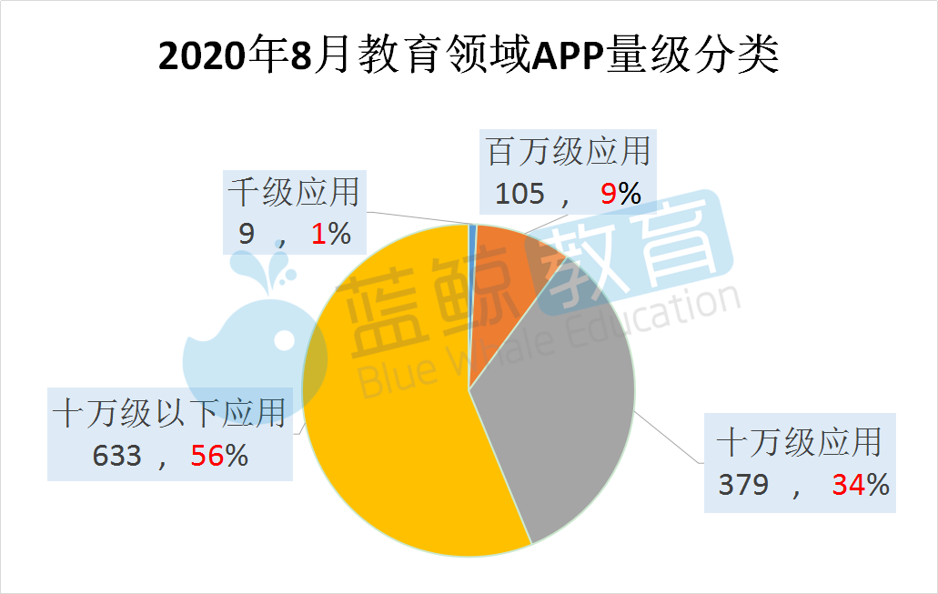 百萬級用户規模APP有 105家,佔比達9%,該級別APP包括:“小伴龍”、“學而思網校”、“快對作業”、“流利説”等APP;十萬級用户規模APP為 367家,相比6月增加了12家,佔比34%,用户規模小於10萬的APP數量最多,達633家,與6月末相比減少了19家,佔比56%。