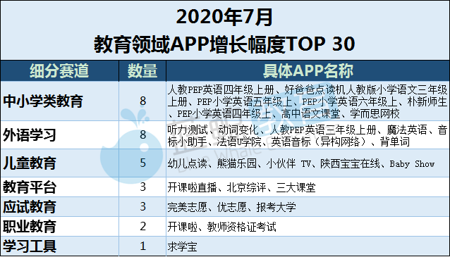 7月進入漲幅TOP 30的應用是:“聽力測試”“動詞變化”“幼兒點讀”“熊貓樂園”“完美志願”“人教PEP英語四年級上冊”“人教PEP英語三年級上冊”“小夥伴 TV”“陝西寶寶在線”“優志願”“好爸爸點讀機人教版小學語文三年級上冊”“求學寶”“PEP小學英語五年級上”“PEP小學英語六年級上”“魔法英語”“樸新師生”“開課啦”“音標小助手”“開課啦直播”“北京綜評”“PEP小學英語四年級上”“高中語文課堂”“Baby Show”“法語U學院”“教師資格證考試”“三大課堂”“報考大學”“英語音標(異構網絡)”“學而思網校”“背單詞”。