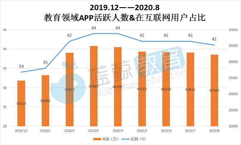 從2019年12月末至2020年8月末,教育領域APP整體呈現上漲趨勢,用户規模從去年年底的34,214萬用户,經歷第一季度的暴漲至45,023萬,二季度開始停下暴漲的步伐,趨勢呈現回落,到2020年8月末,用户規模達42342萬,依然遠高於2019年年末。另外,教育領域的用户規模佔比也從34%提升至41%。