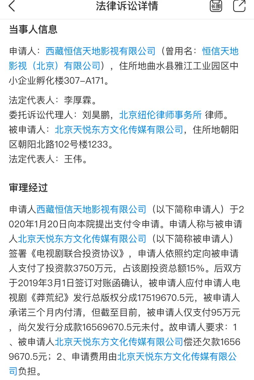 西藏恆信天地影視公司與天悦東方相關案件的民事裁定書顯示,拍攝《莽荒紀》時,恆信天地影視曾按約定向天悦東方支付了3750萬的投資款,佔該劇投資總額15%,按此計算,恆信天地應獲得1752萬發行總版權費用,目前天悦東方尚有1657萬未付。捷成世紀子公司捷成華視網聚文化傳媒與天悦東方也存在合同糾紛,雖未披露具體糾紛內容,但二者唯一的關聯便是《莽荒紀》,由此推測,捷成世紀或也未拿到相關回款。