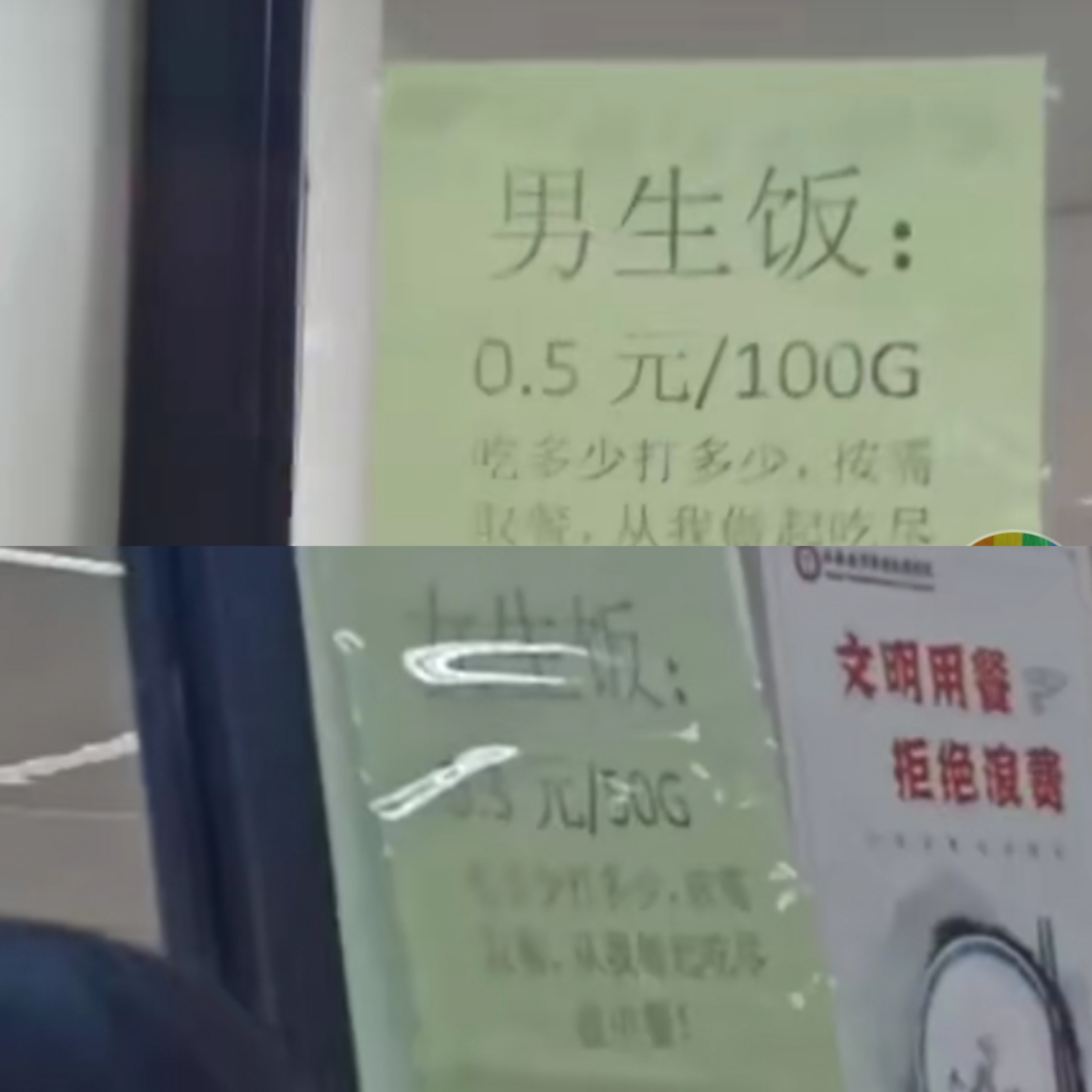視頻顯示,該校食堂打飯窗口貼有“男生飯”和“女生飯”兩張告示:男生飯0.5元/100g,女生飯0.3元/50g。相關負責人回應稱,很多女生吃不完米飯,為了節約糧食才推出男女生版窗口。