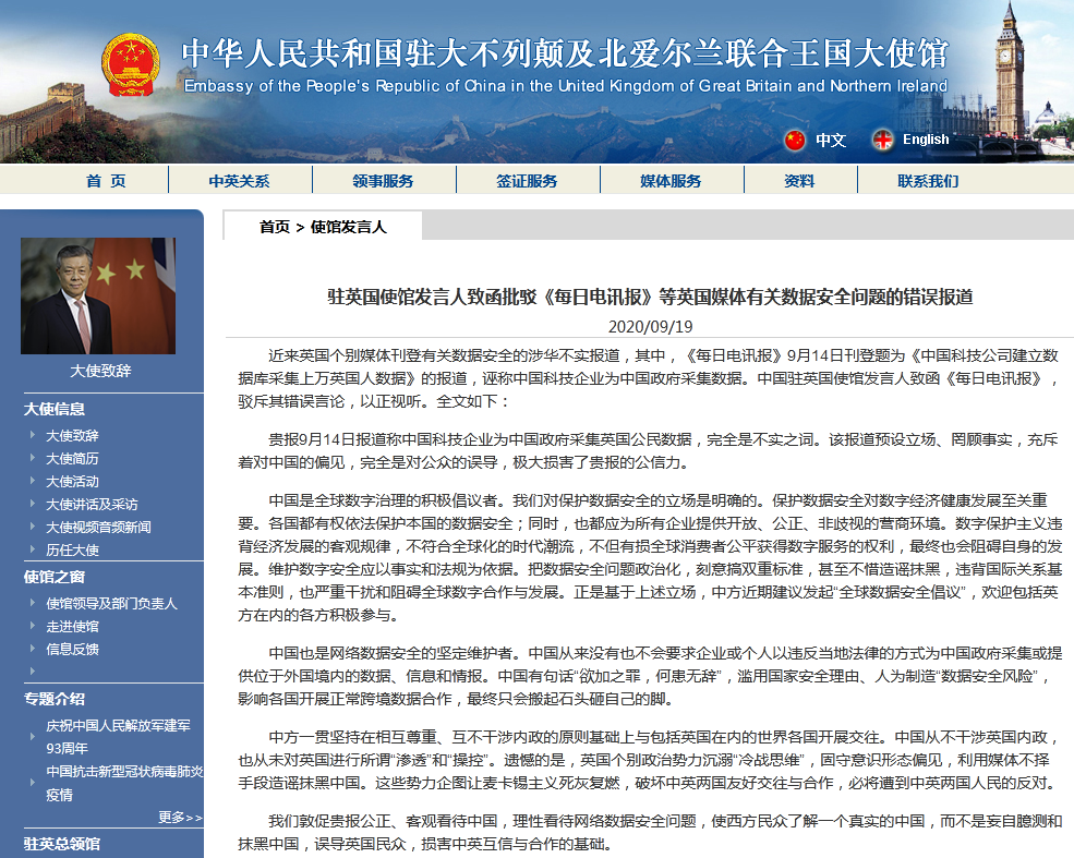 據中國駐英國大使館網站北京時間9月19日消息,駐英國使館發言人致函批駁《每日電訊報》等英國媒體有關數據安全問題的錯誤報道近來英國個別媒體刊登有關數據安全的涉華不實報道,其中,《每日電訊報》9月14日刊登題為《中國科技公司建立數據庫採集上萬英國人數據》的報道,誣稱中國科技企業為中國政府採集數據。中國駐英國使館發言人致函《每日電訊報》,駁斥其錯誤言論,以正視聽。全文如下: