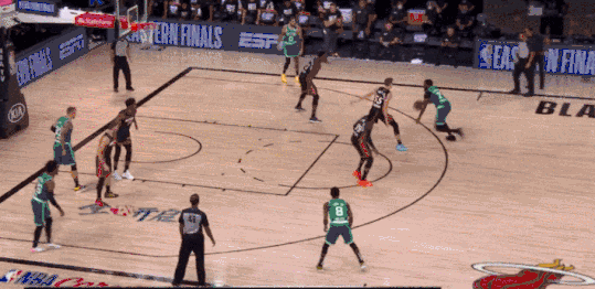 熱火的三分很厲害,但咱們一再強調三分要和內線結合起來才厲害。當綠軍把主要精力放在熱火的突破、空切,以及大力封鎖禁區的時候,至少造成了兩個效應:一、熱火的進攻成功率明顯下降;二、阿德巴約的傳球明顯減少,很多時候他拿着球不知道該往哪裏傳了。