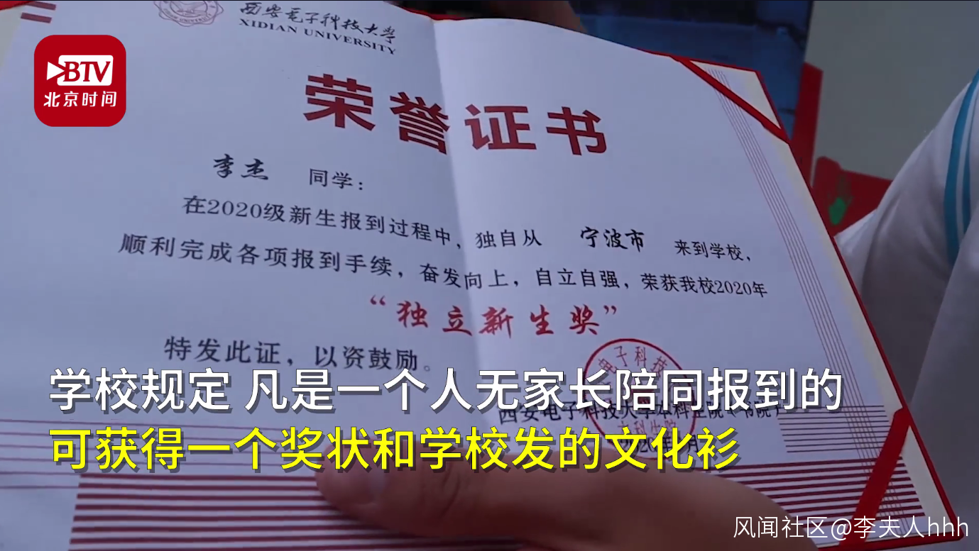 西安電子科技大學特地設立了“新生獨立報到獎”,凡是沒有家長陪同,獨自報到的學生,都能獲得定製文化衫和獎狀,1萬名新生中共有2千人獲獎。