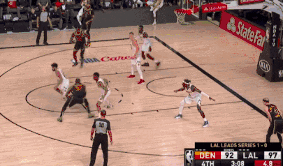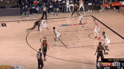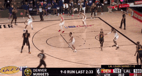 這時候湖人就陷入了快船和掘金第七場的尷尬局面:他們使勁換防,換防完了之後約老師面對錯位他們又得來夾擊,一夾擊約老師出球,整個掘金就被帶活了。