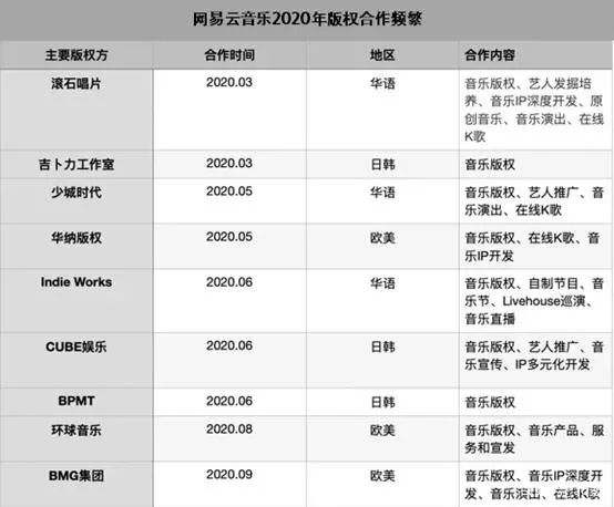 2020年,網易雲音樂在版權上的動作更加頻繁,吉卜力工作室、滾石唱片、華納版權、少城時代、環球音樂、CUBE娛樂、好多音樂均與其達成版權合作,它還拿下《歌手·當打之年》《朋友請聽好》《我們的樂隊 》《中國新説唱2020》等音樂綜藝節目的音樂版權。