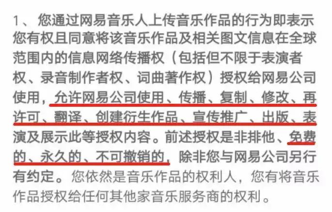 二是網易雲音樂的合作條款也受到了極大的爭議。網易雲音樂可以任意使用創作者上傳到網易雲音樂的原創作品,都不需要經過創作者同意,並且期限是永久。
