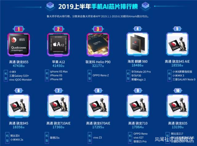 比如在2019年上半年手機AI芯片排行榜上,排名前十的智能手機AI芯片,其中前四名分別是高通驍龍855、蘋果A12 Bionic、聯發科Helio P90和海思麒麟980。但值得關注的是,除了第二、三、四名,這份榜單中的其他位置都被高通驍龍芯片佔據。