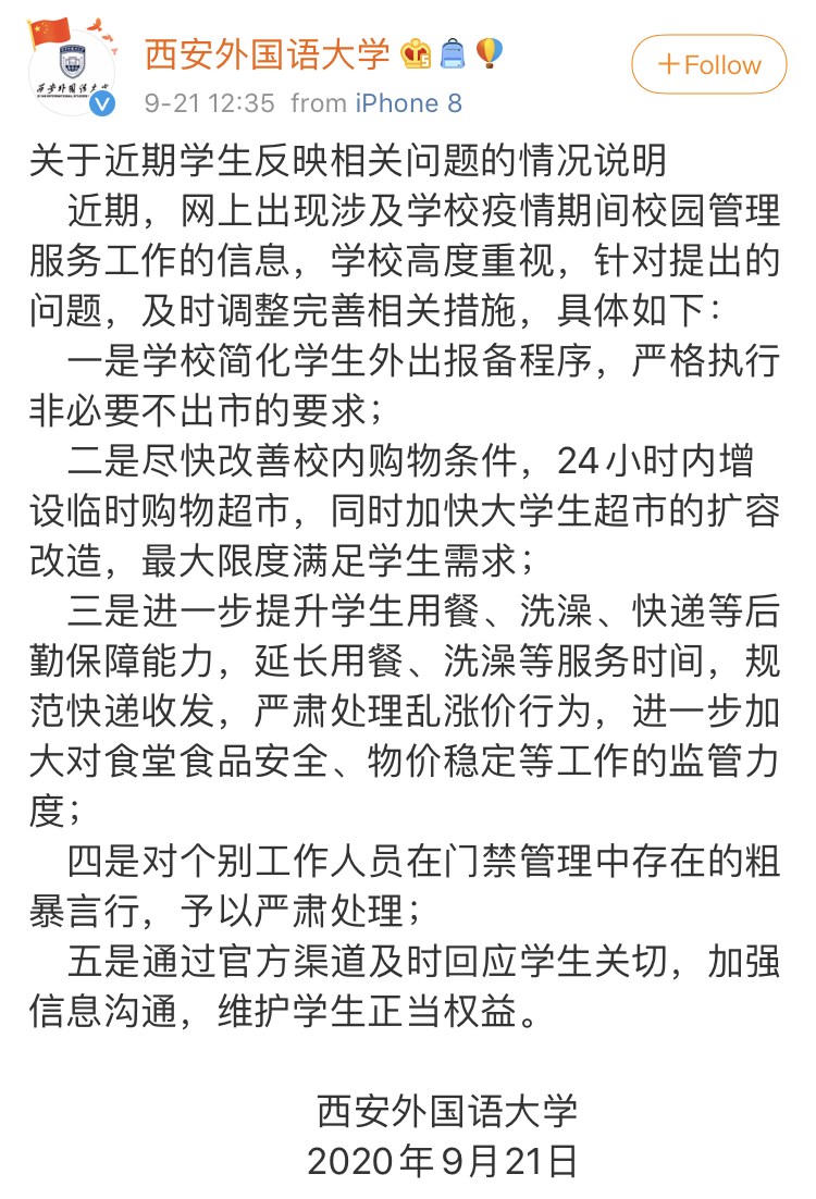 21日中午,@西安外國語大學 正式發佈調整措施,稱將會簡化學生外出報備程序,儘快改善校內購物條件,24小時內增設臨時購物超市,進一步提升學生用餐、洗澡、快遞等後勤保障能力,並對個別工作人員在門禁管理中存在的粗暴言行,予以嚴肅處理,維護學生正當權益。