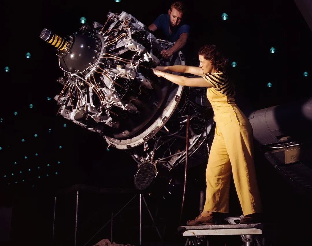 加州長灘的道格拉斯飛機公司,一名女士在接受培訓,精確安裝發動機,1942年10月。圖源Pinterest