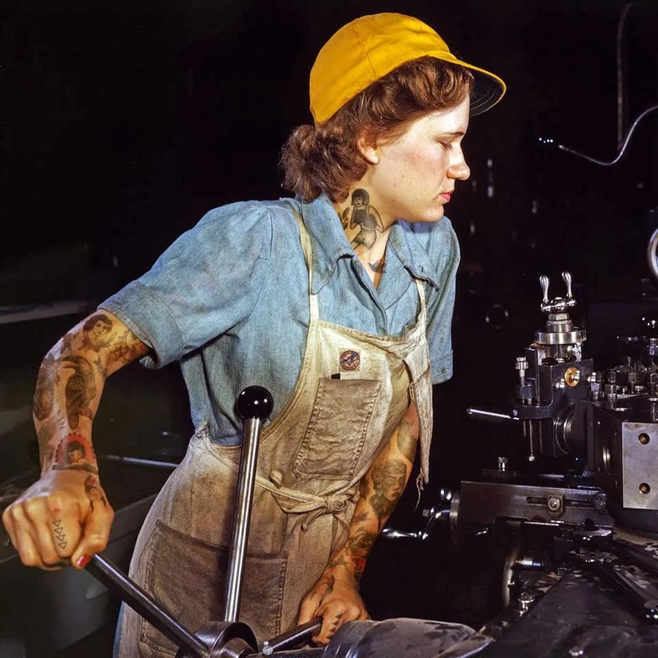 揹帶褲的發展階段其實還具有女性力量崛起的身影,打開20世紀40年代的相冊,能發現許多女性身穿揹帶褲,在傳統為男性工作領域裏埋頭鑽研的凝固瞬間,她們還有一個稱號叫“鉚釘女工”。
