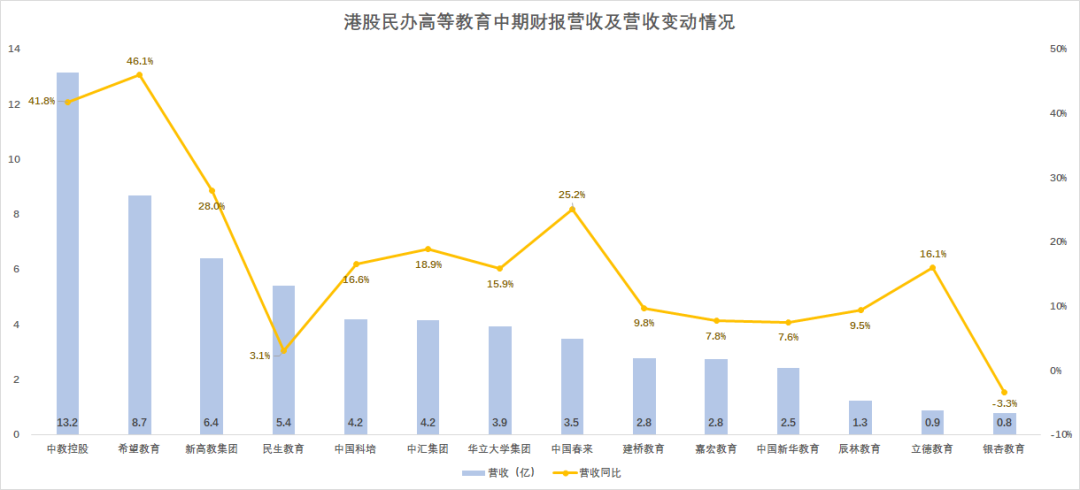 從規模上看,民辦高校上市公司大致可分成三個梯隊:中教控股、希望教育可看作第一梯隊;新高教、民生教育、中國科培、中彙集團、華立大學、中國春來、建橋教育、嘉宏教育、中國新華教育是腰部機構;而辰林教育、立德教育、銀杏教育規模較小。從業績增長看,頭部機構增速明顯,尾部機構則受到明顯衝擊。