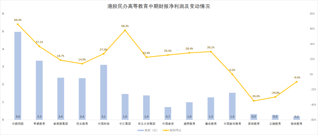 半年報中,民辦高校的盈利能力也十分強勁。14家機構全部實現了正向盈利。不僅如此,14家公司中只有3家機構淨利潤出現同比下滑,其他機構均實現正向增長。