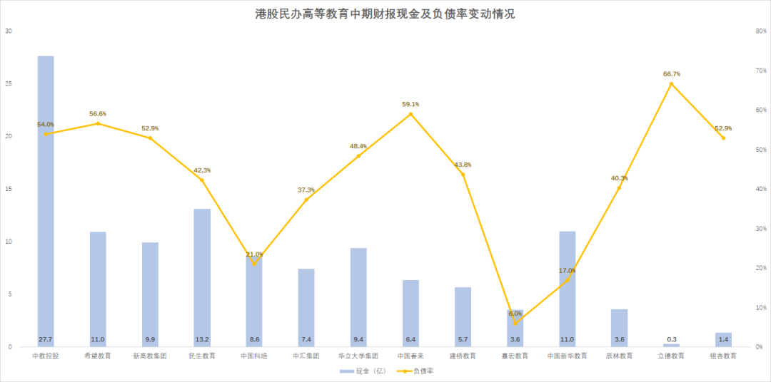 此外,多數機構的毛利率基本保持穩定。雖然有半數機構毛利下滑,但下滑幅度不大,只有辰林教育和立德教育的毛利率下滑超過2個百分點,而建橋教育、中國新華教育的毛利率逆勢增長超6個百分點。各家機構的負債率也保持在較低水平,負債水平的中位數為46.1%,償債壓力不大。14家機構現金水平的中位數為7.4億元,相對於營收中位數的3.7億元,表明各家機構的現金也相對充裕。