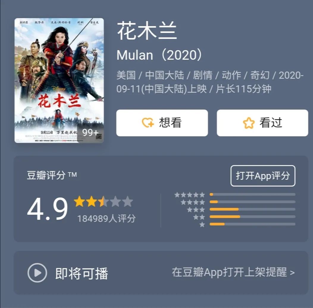 隨着影片在流媒體的熱映,《花木蘭》的高清資源也幾乎在同一時間內流出,這不僅讓其票房受到了致命的打擊,並隨着盜版資源在社交平台的層層傳播,影片本身的低口碑也連續不斷,最終爆發。不少海外網友選擇支付29美元先睹為快。豆瓣在9月5日公佈了其評分,開分即5.9分,此後一路下跌。隨着9月11日其在內地首映,其評分已經跌至4.9分。
