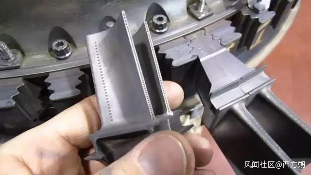 上圖這造型就是典型的渦輪葉片。在燃料和葉片的關係中,燃料的盈餘量很大,所以無論葉片有多牢靠,多倒些燃料,就可以緊緊把葉片逼到奔潰邊緣工作。為了充分壓榨葉片,還有很多冷卻技術,比如,葉片上的小孔,工作時有高速氣流噴出,在葉片表面形成一層氣膜,這叫“氣膜冷卻技術”。