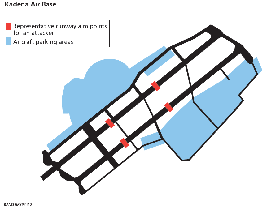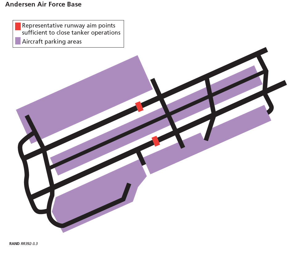 蘭德用作戰模擬方法研究中國對美國空軍基地的攻擊效果。作戰模擬也稱仿真,這實際上是數字化的沙盤演習。蘭德假定飛機散佈在停機坪、機庫和加固機堡內,彈道導彈配備反跑道專用的集束鑽地彈藥,停機坪上暴露的飛機用彈道導彈運載的集束彈藥攻擊,機庫和機堡內的飛機用配備單彈頭的巡航導彈攻擊。在數字沙盤演習中,中國導彈攻擊以嘉手納和安德森為主要目標,以癱瘓時間長度為評估指標。癱瘓時間很短沒有戰術意義,癱瘓時間達到幾天甚至幾周,那雖然不至於就此迫使美國空軍退出戰鬥(美國空軍還可能從更遠的基地出動),但至少極大地降低美國空軍的出動率和戰鬥效率。嘉手納是距離台海最近的空軍基地,這也是台海周邊800公里以內唯一的美國空軍基地,安德森則是離台海最近的美國本土基地。打癱這兩個基地具有最大的典型意義。