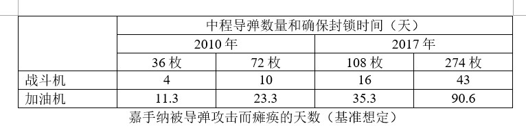 對戰鬥機和加油機癱瘓天數的差別是由於不同的MOS要求,在同樣的彈坑密度下,美軍工兵需要更長時間才能修復更大的連續平整表面,才能供加油機恢復使用。這是理想化的計算結果,實際使用情況當然可以有所不同。比如中國將部分導彈用於封鎖巖國、橫田或者三澤基地,即使不能阻止戰鬥機的使用,也可以阻止加油機的使用。或者留下部分導彈,以備戰爭延長後的後續階段作戰。