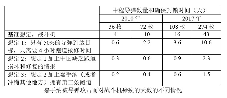 想定1假定中國導彈由於可靠性不足或者美軍反導的有效,能成功到達目標的概率從75%下降到50%,另外,美軍工兵搶修跑道的時間從8小時縮短到4小時。顯然,中國導彈攻擊的有效性大大降低,只發射36枚導彈的話,確保跑道關閉的時間從4天急劇下降到只有0.6天,實際上起不到多少戰術作用。如果中國不具備有效的戰損評估情報,只能每4小時盲目補射,那樣的話,即使有274枚導彈,也只能確保封鎖不到3天,戰術作用有限。