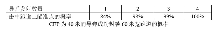對於60米寬跑道,使用CEP為40米和可靠性為85%的導彈,上表列出彈坑分佈不超過15米的概率。顯然,單發導彈已經有相當高的摧毀概率,兩發以上基本上可以確保擊中特定的瞄準點。但要確保四個瞄準點都被摧毀,每個瞄準點各發射兩發只能達到92%的摧毀概率,這是簡單的概率問題。