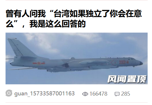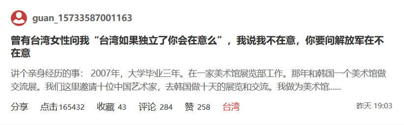 傳送門: 曾有台灣女性問我“台灣如果獨立了你會在意麼”,我説我不在意,你要問解放軍在不在意 評論 354 台灣