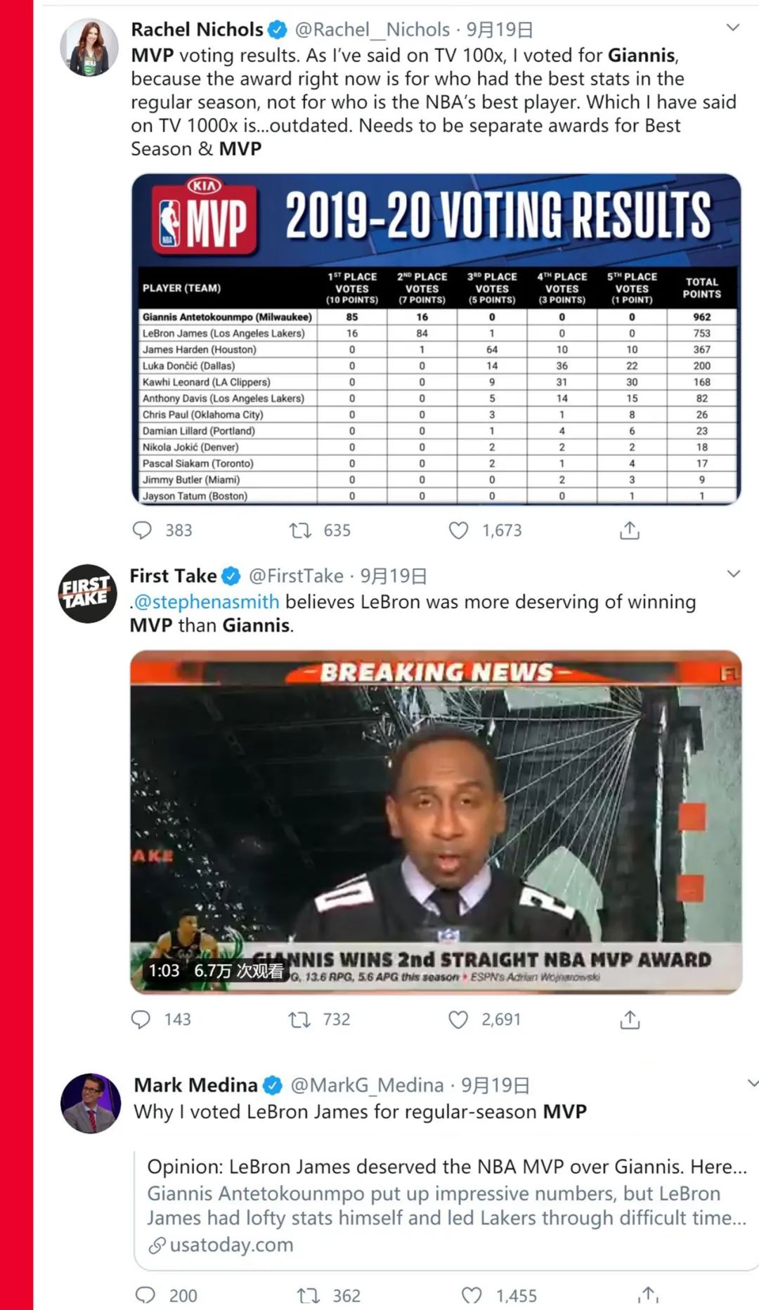 瑞秋·尼古拉斯是ESPN出名的美女主持和記者,她的理由是:我在電視上已經説過一千遍一萬遍啦,MVP是選常規賽數據最好的球員,不是選NBA最優秀的球員。