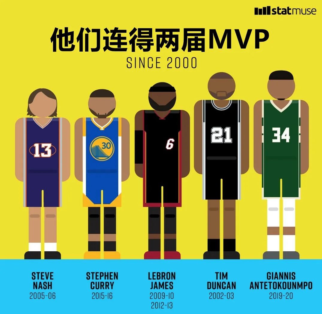 最近20年,連續兩屆MVP只有五個人:納什、庫裏、詹姆斯、鄧肯和字母,其中詹姆斯兩次。