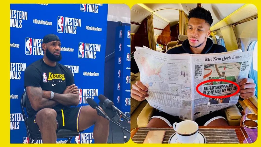 今年常規賽MVP公佈時,詹姆斯剛剛要打西決第一場,而字母正坐在豪華的灣流商務機裏面喝咖啡,手裏拿着一張《紐約時報》,體育版的封面上有他的照片,以及大標題——《安特託昆波連續第二年獲得NBA的MVP》。