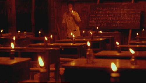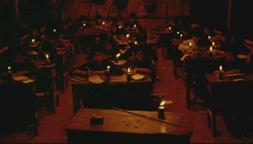夜深,山裏的孩子點着蠟燭,坐在課堂裏抄黑板上的課文。