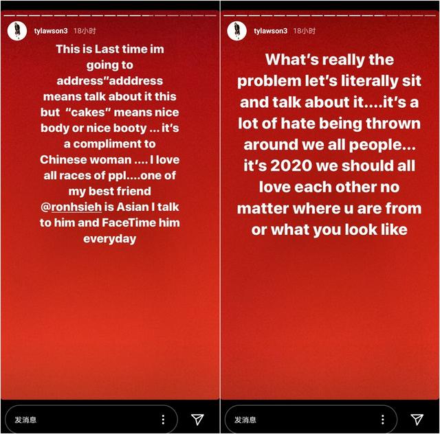 “**這是我最後一次解釋這件事,cakes就是形容身材好,是對中國女性的誇獎。**我喜歡任何種族任何膚色的人,我有個好朋友就是亞洲人,我們天天視頻電話。我們應該坐下來好好聊聊,大家都在發表仇恨的言論,2020年我們應該善待彼此,不論出生與相貌。”