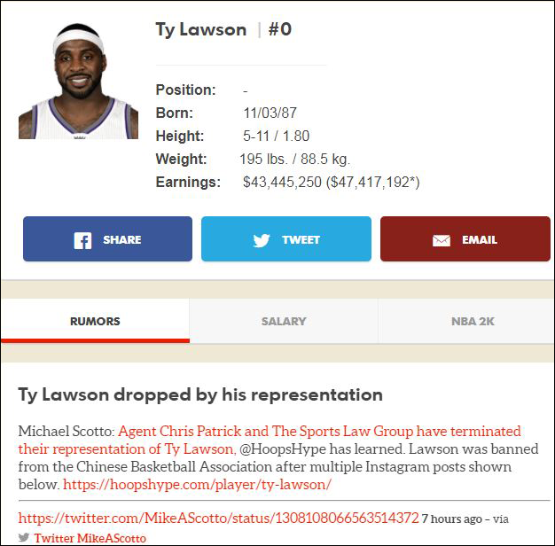 但據美國體育媒體最新報道,因為其爭議行為,勞森的經紀公司目前已和他解約。