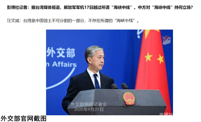 在9月21日外交部發言人汪文斌主持例行記者會上,有彭博社記者問到:據台灣媒體報道,解放軍軍機17日越過所謂“海峽中線”。中方對“海峽中線”持何立場?外交部發言人汪文斌:台灣是中國領土不可分割的一部分,不存在所謂的“海峽中線”。