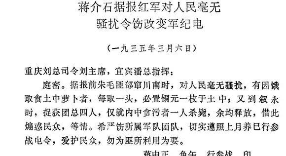 1935年,蔣介石看到紅軍對人民秋毫無犯,吃羣眾一顆蘿蔔就要在土上放一枚銅元,再看看自己手下的那些人,簡直是恨鐵不成鋼,於是專門發了一封電報讓他們多學着點。