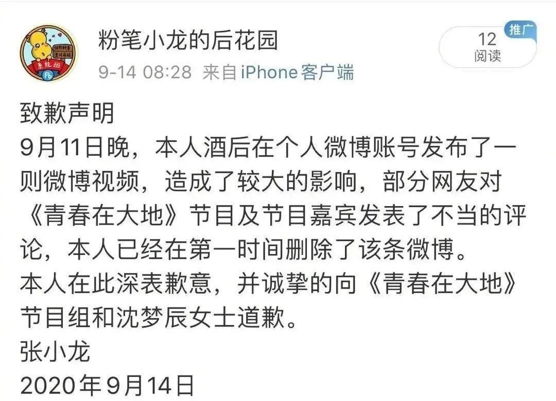 此後張小龍微博被封。9月14日一個名為“粉筆小龍的後花園”的微博賬號以張小龍的名義發佈致歉聲明,表示向節目組與沈夢辰道歉。