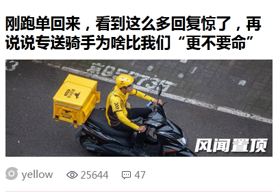 《剛跑單回來,看到這麼多回復都驚了,再説説專送騎手為啥比我們“更不要命”》 ----- yellow