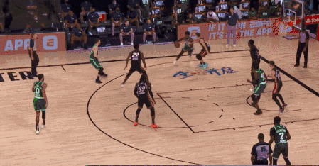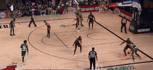 綠軍第三節4個三分,塔圖姆和布朗一人進了一個轉換,剩下兩個都是綠軍去突熱火的防守弱環再傳出來投進的。