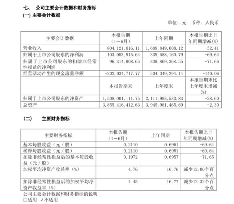根據公告,上半年,水井坊實現營業收入為8.04億元,同比降52.41%;實現淨利潤為1.03億元,同比降69.64%;實現扣非淨利潤為9631.49萬元,同比降71.66%。