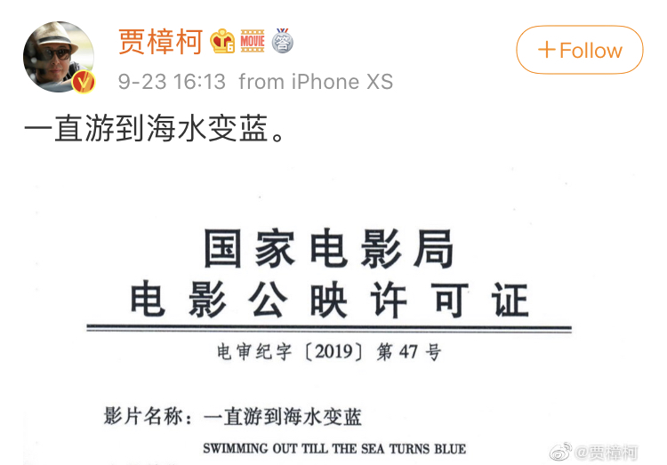 9月23日,@賈樟柯 在微博宣佈了該片獲得國家電影局公映許可證的消息。