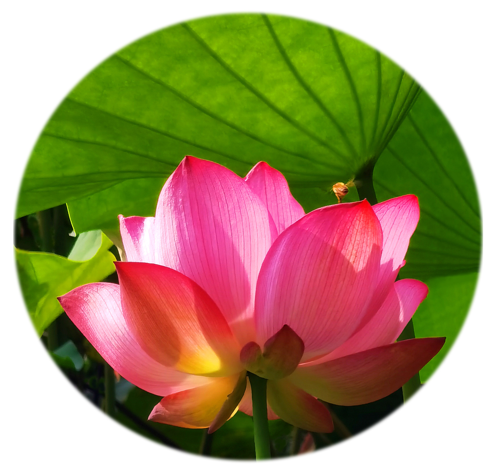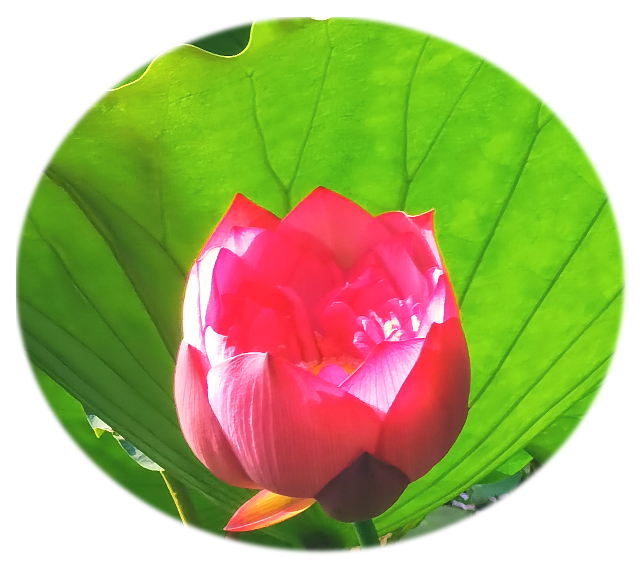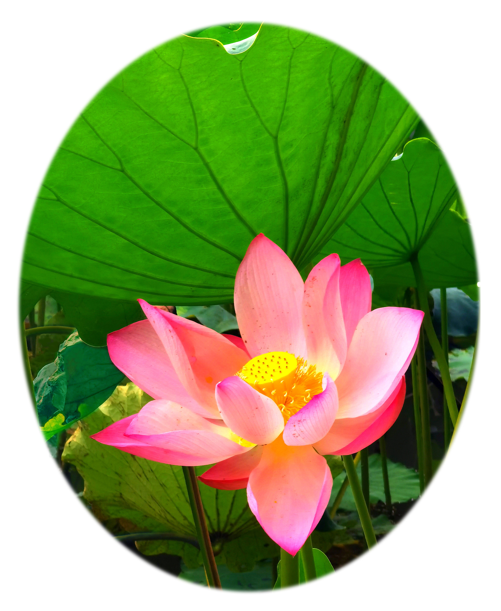 桃紅玉瓣金黃蕊,綠蓬青蓮下一幕