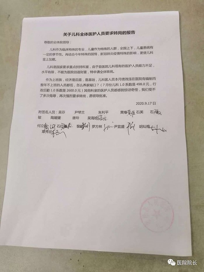 9月17日,微信公眾號“醫院院長”曝光了宿松縣人民醫院的10名兒科醫護人員向全體院領導遞交了一份要求轉崗的報告。報告中寫道,該院兒科醫護人員月績效比在醫院有編制而整年不上班的人員還要低(7月份兒科1.0係數是498.0元,行政後勤1.0係數是2600.0元)。報告言辭激烈,稱“受不了多次侮辱,再次強烈要求轉崗。”