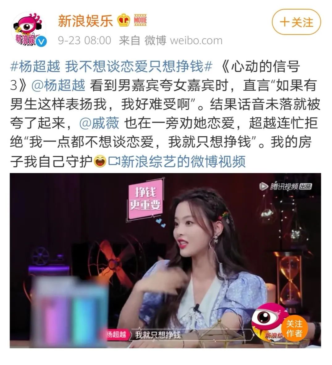9月23日,楊超越在綜藝節目《心動的信號3》中曝出金句“我一點都不想談戀愛,我就只想掙錢”,引起網友熱議,並登上微博熱搜。