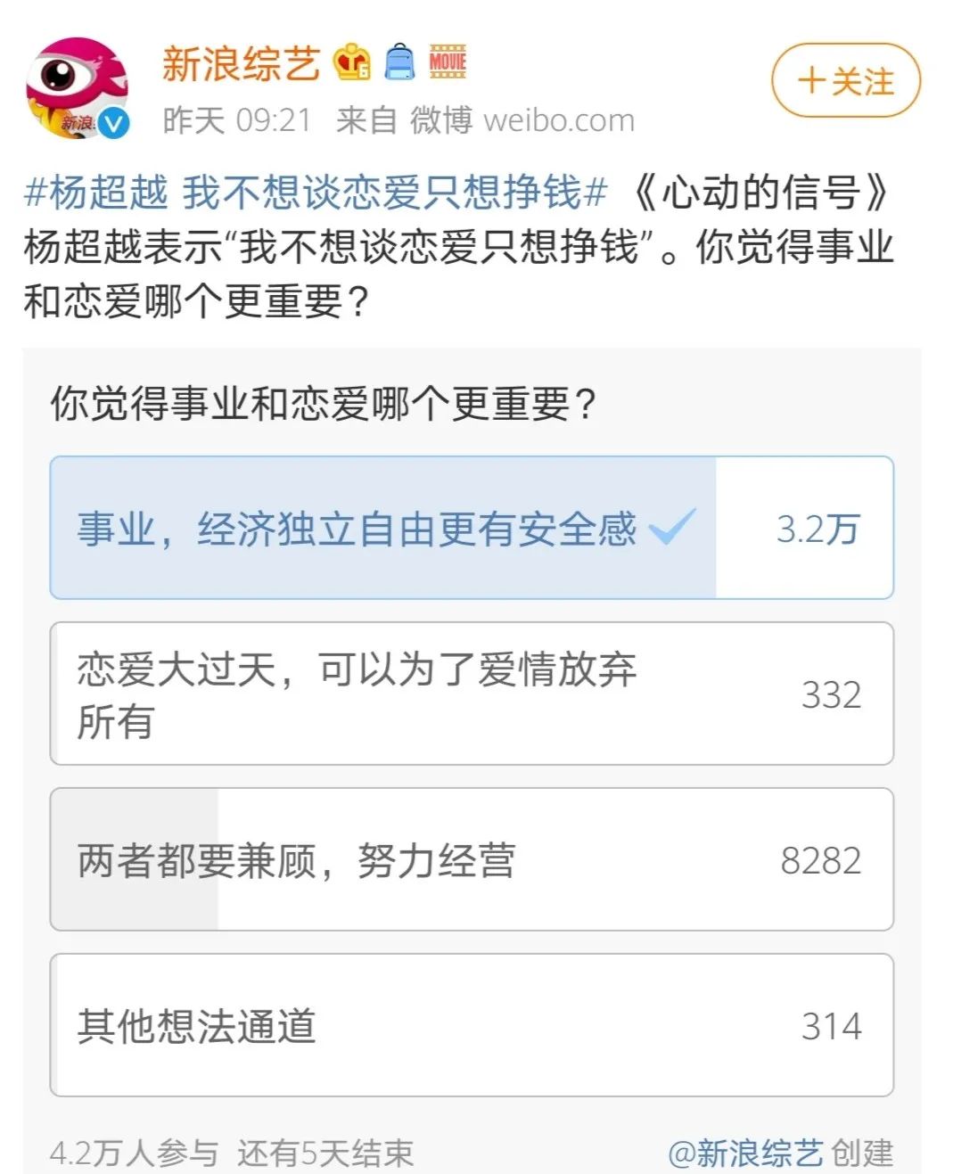 對此,新浪綜藝還發起了一個#你覺得事業和戀愛哪個更重要#的投票,結果顯示,“經濟獨立自由更有安全感”的選項,以壓倒性的優勢位列第一,再一次印證了“這屆年輕人不想談戀愛只想搞錢”的人間真相。