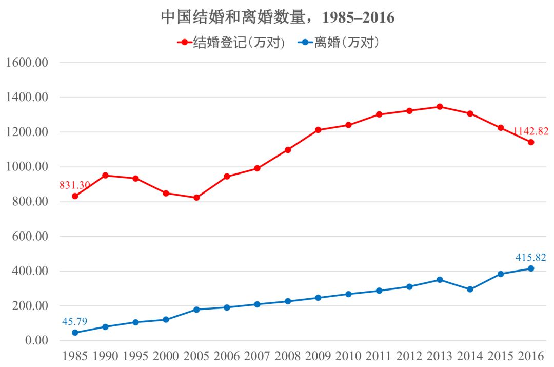 看下面這圖,感覺再有個8年,每年離婚人數就追上結婚人數了。