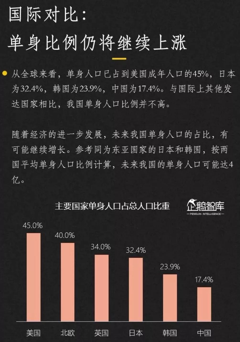 2018中國統計年鑑的數據顯示:2017年全國15歲以上未婚人口總數為2.15億,再加上2300萬離婚人數,我國單身人口規模已達到2.4億。